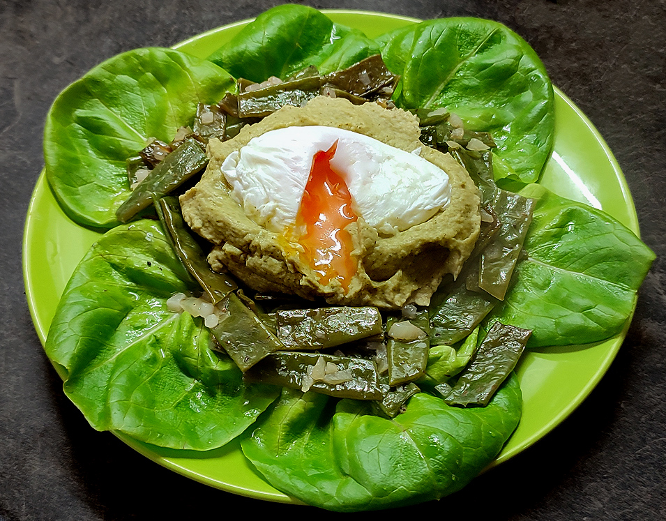 Grüner Teller: Püree, Bohnen, Salat, pochiertes Ei