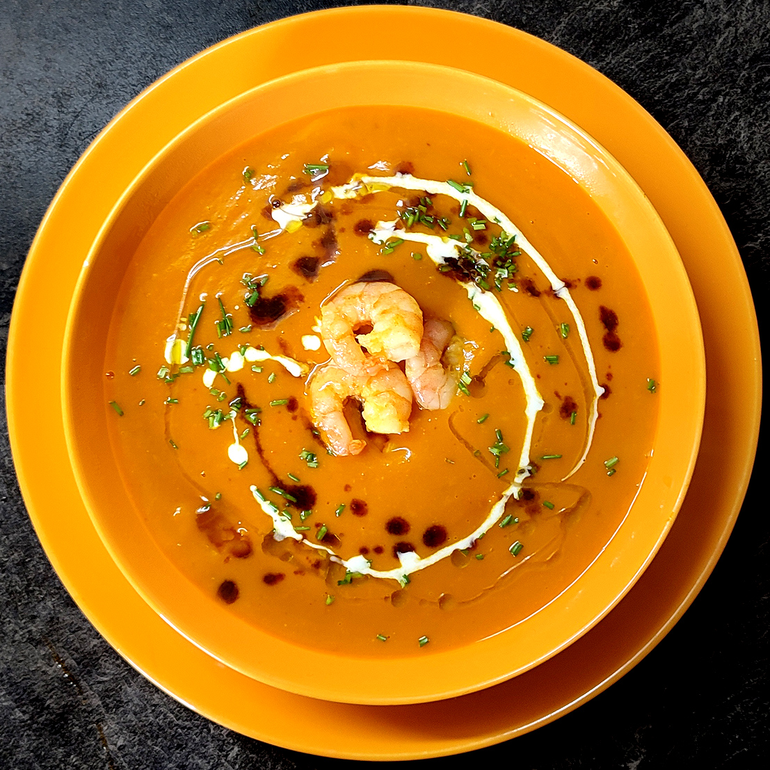 @ Kokos-Kürbis-Suppe mit Garnelen
