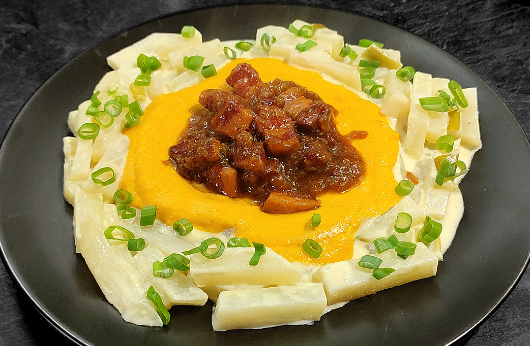 Zwiebel schnibbeln, anbraten, mit viel Sahne ablöschen und einköcheln lassen. Das restliche Gemüse kleinschneiden und in die Sahne geben. Den gut gespülten Konjak-Reis aus der Lake dazugeben und mit Austernsauce, Do Plovy, einer Gewürzmischung für Pilav, Salz und Pfeffer abschmecken.